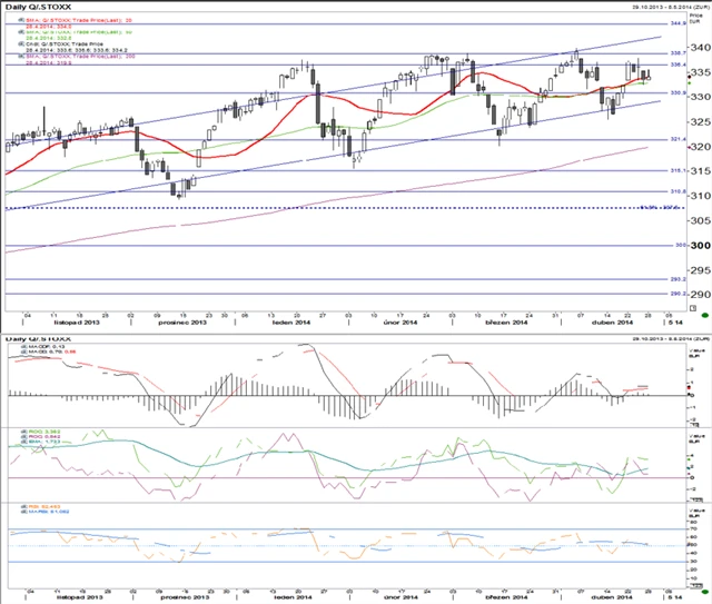 Index se odrazil od horní hrany trendového kanálu níže až do okolí 50denního klouzavého průměru. MACD je v těsné blízkosti spouštěcí linie a snadno může vydat prodejní signál. ROC60 pozvolna klesá k nule a ROC20 pod ni spadlo. RSI je aktuálně poblíž 50 bodů.