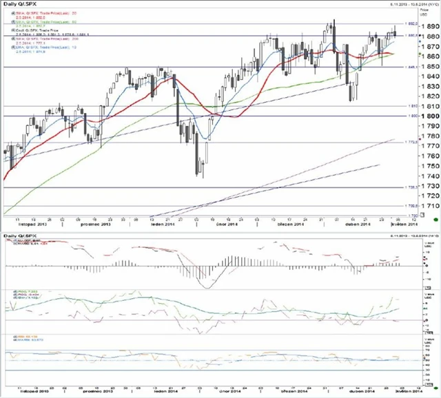 Index smazal nárůst z předcházejících dnů. Nadále se drží mírně nad 20denním klouzavým průměrem. MACD se pomalu shora blíží ke spouštěcí linii. Obě ROC poslední dny klesají. ROC20 dokonce pod nulu. RSI koriguje k úrovni 50 bodů.