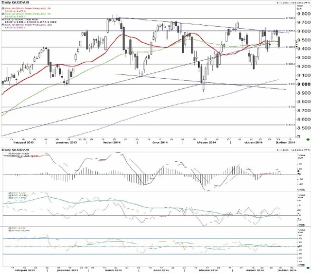 Technické indikátory jsou neutrální, snadno se ale mohou ještě zhoršit. Pokud se index rychle nedostane nad 50denní klouzavý průměr (zelená linie), hrozí pokles až k předchozímu lokálnímu minimu okolo 9 200 bodů.