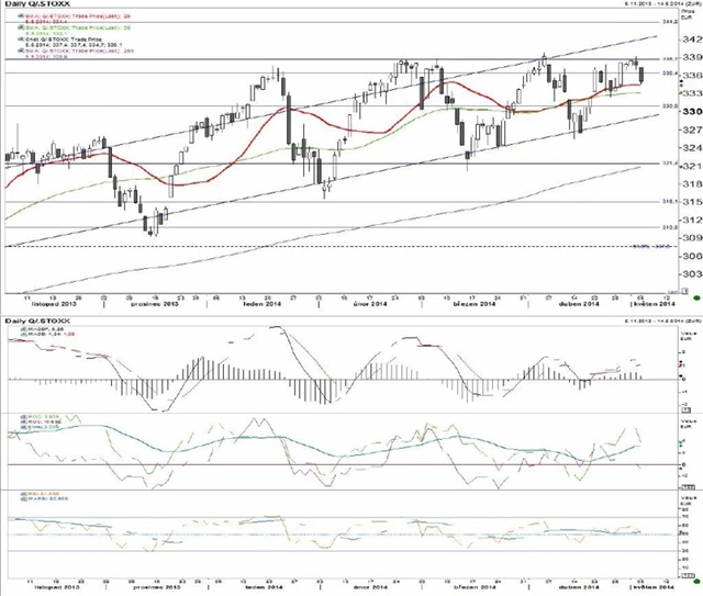 Technické indikátory jsou souhrnně jen mírně pozitivní, situace se ale může rychle otočit. Pro další vývoj bude důležité, zda se index udrží nad 50denním klouzavým průměrem. Při jeho prolomení by hrozil pád až k 330 bodům, kde je aktuálně i spodní hrana rostoucího trendového kanálu.