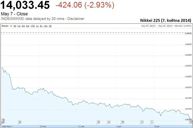 Nikkei ztratil 2,93 % a zakončil jen lehce nad 14 tisíci body. Hongkongský Hang Seng odepisoval kolem procenta, a 0,9 % ztratil i čínský Shanghai Composite. Australský S&P/ASX 200 klesl o 0,8 % a jihokorejský Kospi po volnu ztratil procento.