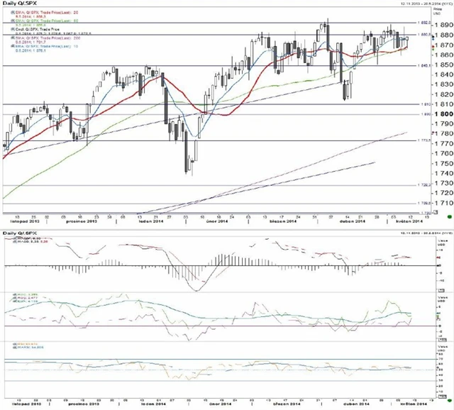 1 891 rekordní maximum, 1 868 20denní klouzavý průměr, 1 866 50denní klouzavý průměr, 1 800 psychologická úroveň, 1 798 rostoucí (horní) trendová linie, 1 782 200denní klouzavý průměr.