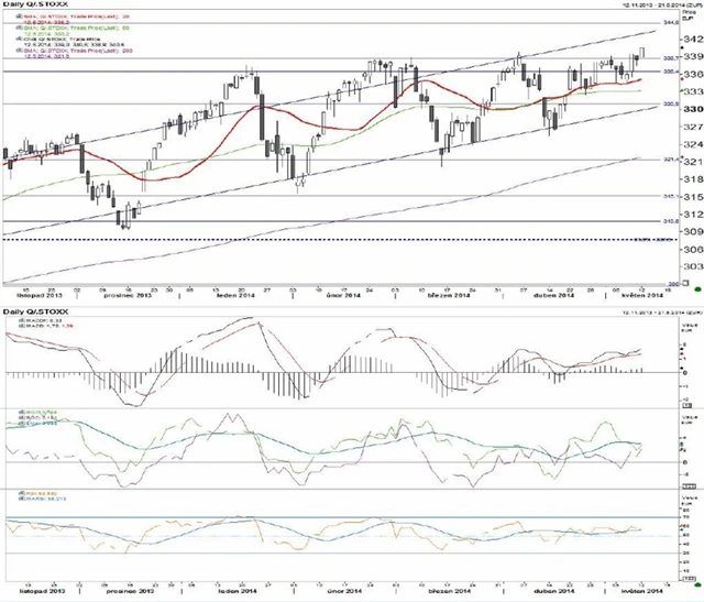 Technické indikátory postupně slábnou. Pro další vývoj bude důležité, zda se index udrží nad 20- a 50denním klouzavým průměrem. Očekáváme, že index se bude dále vyvíjet do strany v relativně úzkém pásmu mezi klouzavými průměry a historickým předchozím maximem.