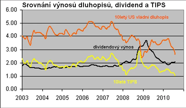 Zajímavé je i srovnání dividendových výnosů, které jsou samozřejmě vztaženy k ceně akcií, a výnosů amerických vládních dluhopisů a státních cenných papírů chráněných proti inflaci (TIPS).