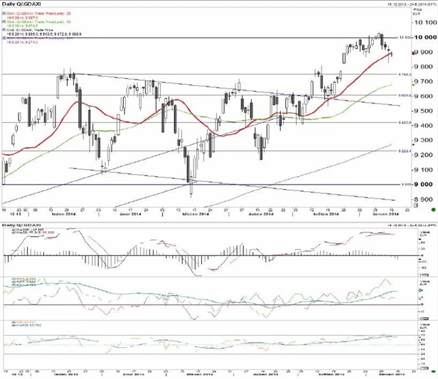 Technické indikátory se v posledních dnech zhoršily, a to především vlivem prodejního signálu na MACD. Bude klíčové, zda se index udrží na 20denním klouzavém průměru (červená křivka). Pokud ano, brzy uvidíme další pokus o překonání 10 tisíc bodů, pokud ne, indexu by se otevřela cesta níže.