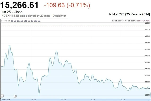 Náladu na asijských trzích navíc podkopala i slabá seance na Wall Street. Index Dow zažil největší pokles za poslední měsíc navzdory pozitivním makrodatům. Spotřebitelská důvěra v červnu vzrostla více, než se čekalo, prodeje nových domů v květnu byly lepší, než trh predikoval, a index cen domů S&P/Case-Shiller ukázal meziroční nárůst o 10,8 %.