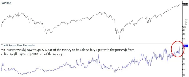 Index sledovaný bankou Credit Suisse právě dosáhl 37 % a nikdy nebyl výše. Ve své podstatě znamená, jak velká poptávka je po ochraně put opcí - tedy jak velký strach panuje na trhu při pohledu do budoucna.