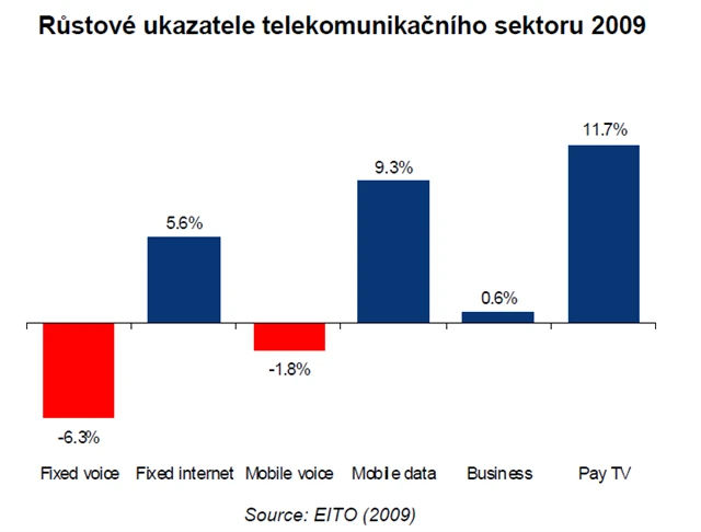 Přesun z pevných linek na mobilní sítě je v České republice velmi výrazný, v roce 2009 bylo 83 % hlasové komunikace realizováno z mobilních telefonních čísel (81 % v roce 2008). Penetrace trhu v oblasti broadbandových služeb vzrostla ze 17,1 % v lednu 2008 na 19,1 % populace v lednu 2009, což je pod průměrem evropské sedmadvacítky, který činí 24,8 % (zdroj: Evropská komise).
