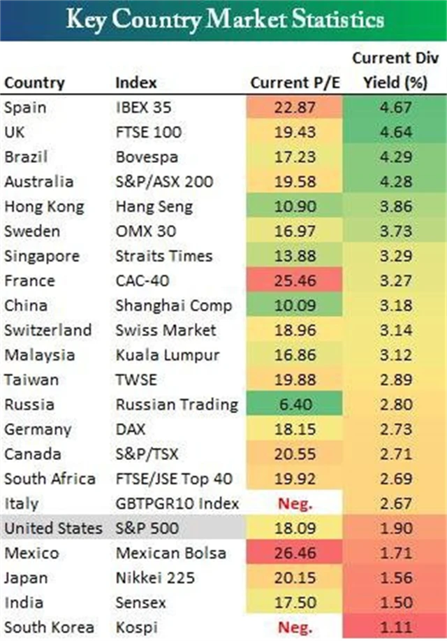 Nejvyšší dividendový výnos nabízejí aktuálně španělské akcie, a to navzdory více než 30% rally za poslední rok. Přes 4 % ročně vynášejí ještě trhy v Británii, Brazílii a Austrálii. S výjimkou Brazílie jsou ale jejich akcie také mírně "dražší" než ty americké (podle P/E za uplynulých 12 měsíců). Pražská burza a několik dalších, třeba v Latinské Americe, by celý žebříček strčily do kapsy, svým významem a velikostí ale na uvedené trhy tak nějak nestačí. Podle agentury Bloomberg je aktuální dividendový výnos v Praze 4,59 %.