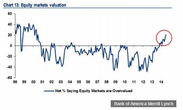Manažeři jsou dokonce tak optimističtí ohledně dalšího růstu, že ignorují fakt, že jsou akcie nadhodnocené. Což ovšem sami přiznávají. Rozdíl mezi těmi, kteří mluví od "drahých" akciích, a těmi, kteří je vidí podhodnocené, je 21 procentních bodů, nejvíce od roku 2000. Největšími riziky pro akcie jsou dle nich geopolitická krize a případná neschopnost Číny splácet dluhy.