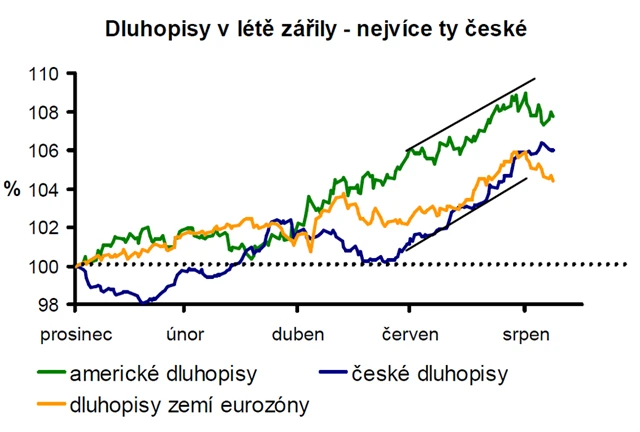 Naopak dluhopisové trhy mají za sebou velice úspěšné léto. Největší zhodnocení přinesly české obligace. Během dvou prázdninových měsíců vydělaly svým držitelům v průměru více než 4 %. Při měření od začátku roku však vycházejí ty americké ještě o něco lépe.