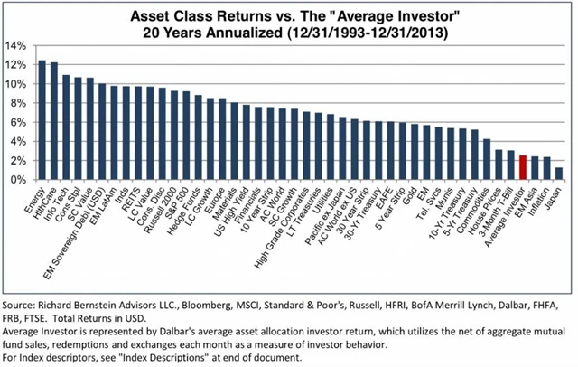 "Výkonnost průměrného investora v tomto časovém období je šokující. Investoři zaostali za každou kategorií vyjma asijských rozvíjejících se trhů a japonských akcií. Průměrný investor dokonce zaostal za hotovostí, kterou zde reprezentují 3měsíční americké státní dluhopisy. To dokazuje, že drobní investoři zkrátka neumějí časovat trh," říká Bernstein, který vycházel z nákupní a prodejní aktivity investorů do podílových fondů.