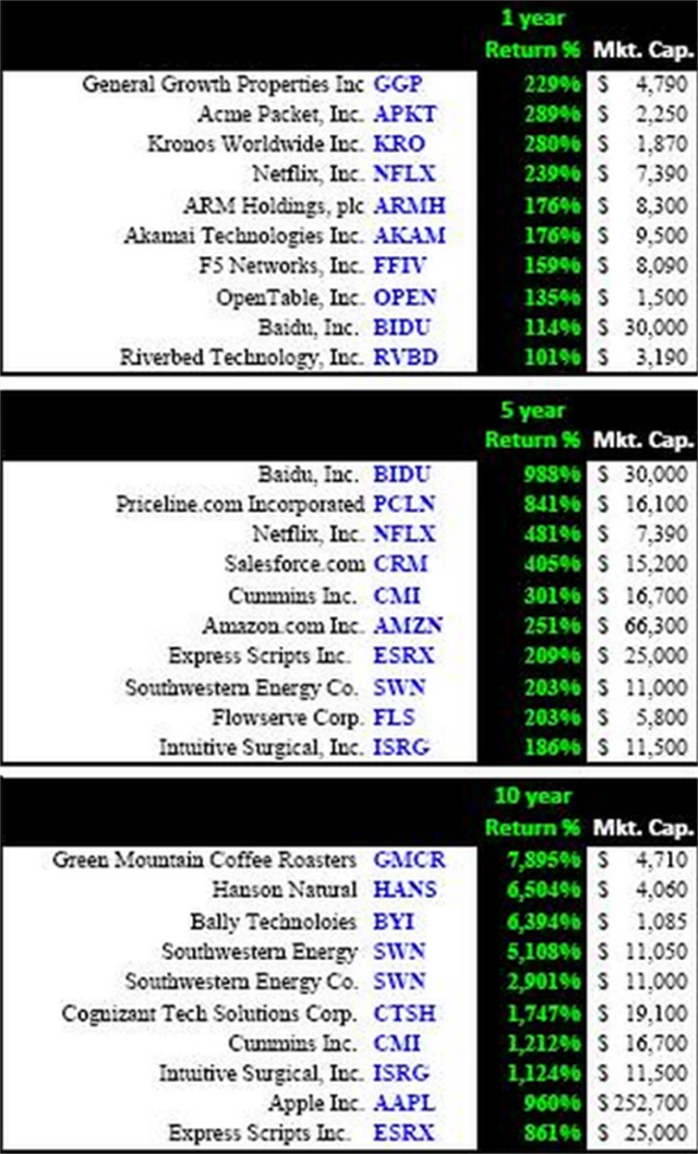 Akcioví vítězové uplynulých let v USA, zdroj: Wall Street Cheat Sheet