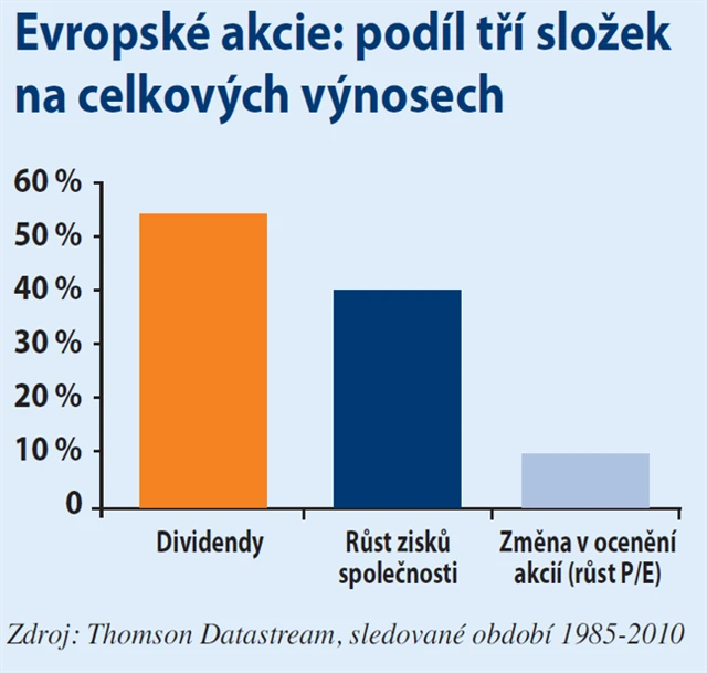 Předpokládáme, že celková výkonnost portfolií v blízkém období bude tažena spíše výnosy z akcií (dividendami) než růstem jejich cen. Na grafu je vidět, jak se dividendy podílely na celkových výnosech evropských akcií v letech 1985-2010.