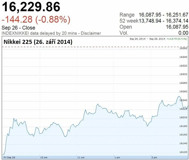 Čínský Shanghai Composite posílil o 0,11 %. Australský S&P/ASX 200 naopak odepsal 1,28 %, korejský KOSPI klesl o 0,12 % a japonský Nikkei 225 uzavřel se ztrátou 0,98 % na 16 229,86 bodu. Hongkongský Hang Seng necelou hodinu před koncem obchodování klesal o 0,45 %.