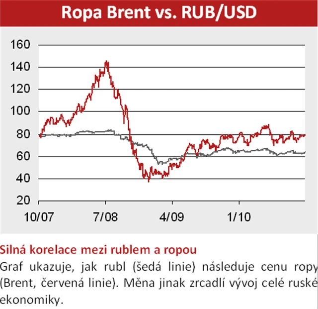 Samozřejmě, rubl je výrazně závislý na ceně ropy. Energetika se konečně podílí na hrubém domácím produktu zhruba jednou pětinou. Podíl exportu energie na celkových vývozech zboží leží dokonce na úrovni dvou třetin. Proto platí jednoduché pravidlo: zvyšuje-li se cena ropy, šplhá nahoru i rubl. V rublu je však ze strany investora neseno také nastíněné politické riziko.