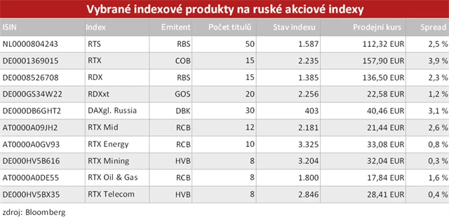 Na výplatu dividend se musí rezignovat u všech ruských akciových indexů, stejně tak i u barometru RTX kalkulovaném vídeňskou burzou. Ten se skládá dohromady pouze z 15 titulů, přičemž energetický sektor zaujímá více než 60 procent indexové váhy. Riziko z vývoje rublu však zůstává u všech investic, byť se index počítá v eurech. Změny v měnové relaci se pak přímo projevují na hodnotě indexu.