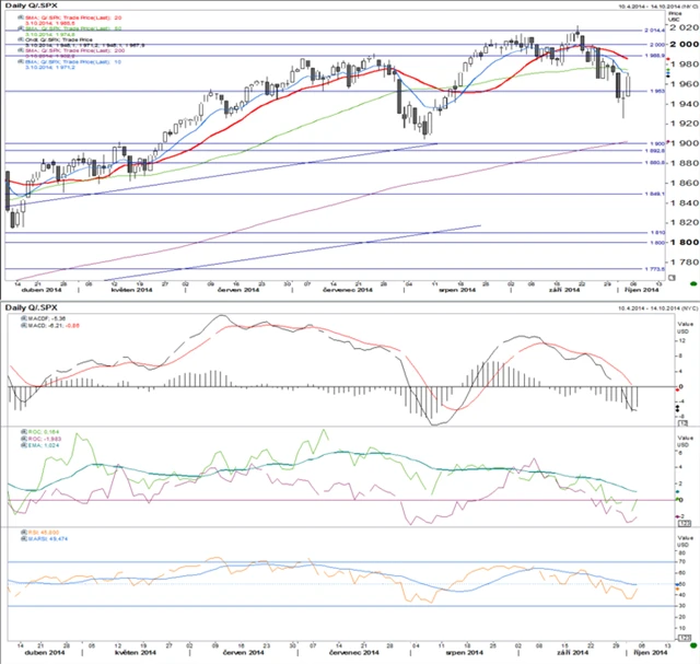 2 000 psychologická hranice, 1 986 20denní klouzavý průměr, 1 975 50denní klouzavý průměr, 1 902 200denní klouzavý průměr.