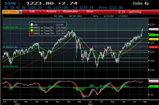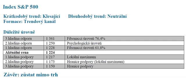 Překoupenost indexu je vysoká, sklon klouzavých průměrů také, což potvrzuje silný trend. Index prolomil veškeré hladinyodporu, teď je na čase vybrat si oddechový čas. MACD se nachází v překoupeném pásmu, k vyslání prodejního signálu ještěnedošlo. Pro následující vývoj by byla vhodná konsolidace, jinak by hrozilo prudší vybírání zisků.