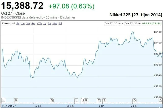 Japonský Nikkei v pondělí připsal 0,63 % a zakončil na novém dvoutýdenním maximu, když se japonský jen zároveň pohyboval na téměř třítýdenním minimu vůči dolaru a více než dvoutýdenním minimu vůči euru.