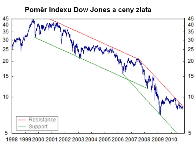 Dow/Gold ratio udává poměr mezi hodnotou indexu Dow Jones a cenou zlata za unci. V tuto chvíli je potřeba k "nákupu" indexu Dow Jones 8 uncií zlata, což je o vice než 80 procent méně než 44,8 uncí, které bylo potřeba k nákupu indexu Dow Jones v roce 1999. Jinými slovy, přestože akcie (Dow) zaznamenávají v posledních týdnech své pokrizové rekordy, jsou v porovnání s cenou zlata velmi podhodnocené.