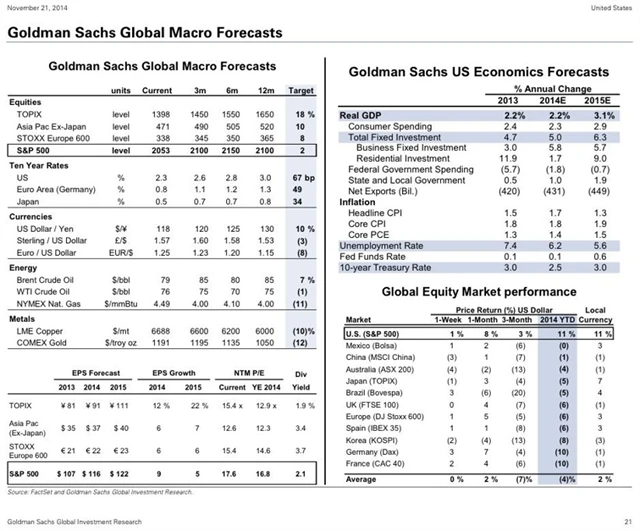 Analytici a stratégové z Goldman Sachs na konci listopadu zaplavili trh - podobně jako jejich kolegové z dalších velkých bank - svými předpověďmi dění na trzích v roce 2015. Pokud nemáte čas číst všechny ty věštby, možná vám udělá radost následující tabulka.