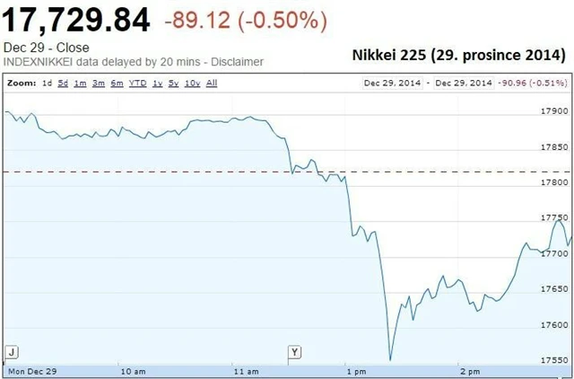 Japonský Nikkei odevzdal původní zisky a ztratil 0,5 %. Trhy vyděsila zpráva o možném výskytu eboly v Tokiu, kterou zveřejnilo ministerstvo zdravotnictví. Muž, který je v současnosti v karanténě v tokijské nemocnici, se vrátil do Japonska ze Sierry Leone, kde na začátku měsíce strávil osm dní. Jedinou společností, jejíž akcie ze zprávy profitovaly, byla Fujifilm Holdings, která v listopadu oznámila, že by její lék na ebolu měl být schválen regulačními úřady do konce letošního roku.