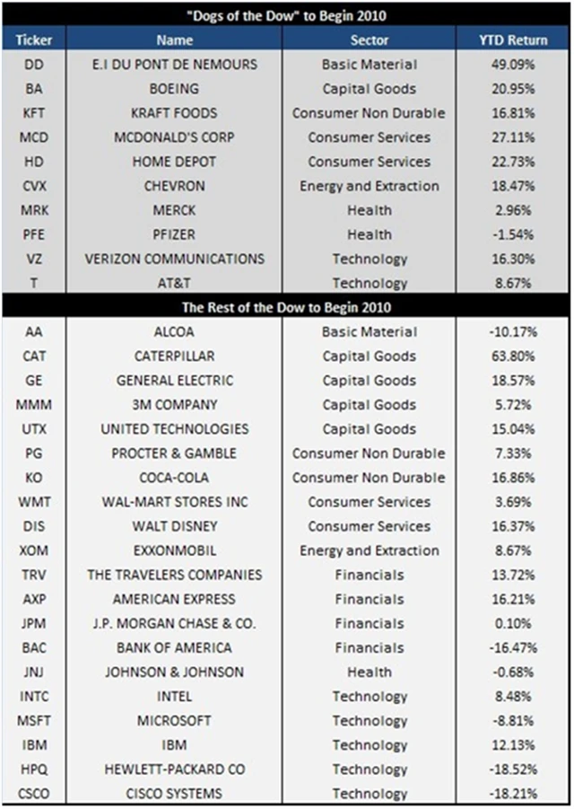 V roce 2010 se akciím v indexu Dow dařilo následovně: