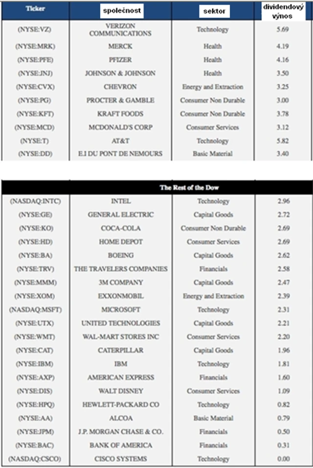 Během roku se v rámci indexu ohledně dividendových výnosů mnoho nezměnilo. Boeing a Home Depot vypadly na úkor Johnson & Johnson a Procter & Gamble. Na dalším grafu je vidět desítka nejvýnosnějších dividendových titulů z indexu Dow na prahu roku 2011.