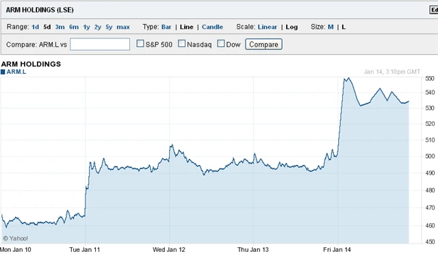 A druhý graf jasně ukazuje, že z pohledu investora jsou akcie ARM růstovým hitem dávno. V ročním srovnání si křivky vývoje akcií Intelu skoro ani nevšimnete. A to graf nezohledňuje právě páteční růst akcií ARM v Londýně.