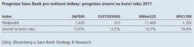 Jak vstupujeme do zralé fáze výsledkového cyklu, hledáme smysluplné návratnosti z akciových trhů v roce 2011. Těch se podle našeho názoru dosáhne zlepšením ekonomické situace, které bude obzvlášť znatelné v USA, což bude mít zase vliv na pokles rizikové prémie u akcií a povede k růstu akciových trhů. Náš odhad cílové hodnoty indexu MSCI World na konci roku činí 1 400 bodů oproti současným 1 275, což předpokládá 10% nárůst ze současných úrovní.