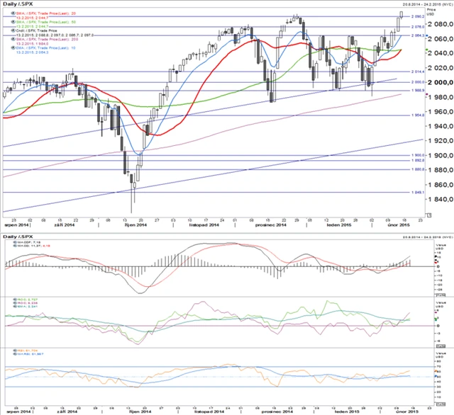 2 097 maximum, 2 045 50denní a 20denní klouzavý průměr, 2 000 psychologická hranice, 1 984 200denní klouzavý průměr.