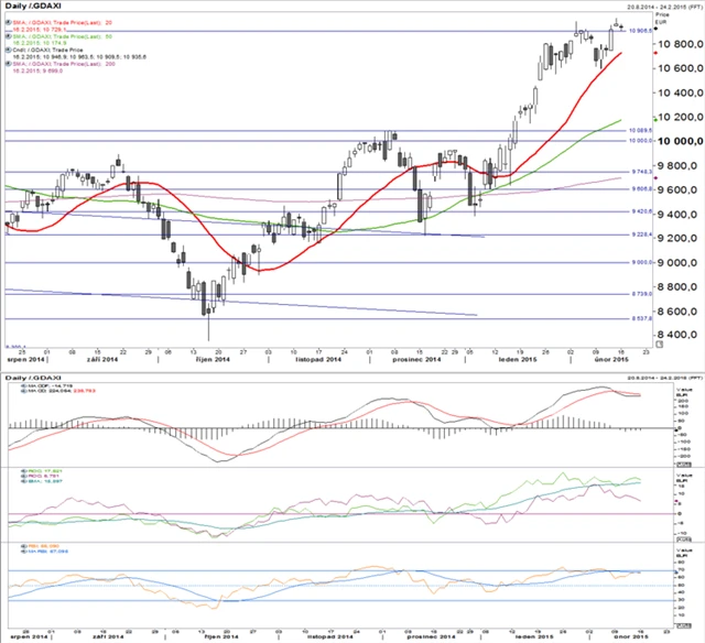 Index se posunul na nové lokální maximum. MACD je mírně pod spouštěcí linií. ROC20 koriguje, ROC60 se ještě drží vysoko. RSI je na hranici překoupenosti.