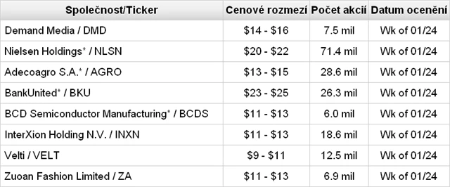 S nabídkou 7,5 milionu kusů akcií se na trh dostaví kalifornská Demand Media (DMD), světový poskytovatel registrací domén. Vedoucími emise jsou Goldman Sachs a Morgan Stanley. Cena akcií v IPO je 14-16 USD.
