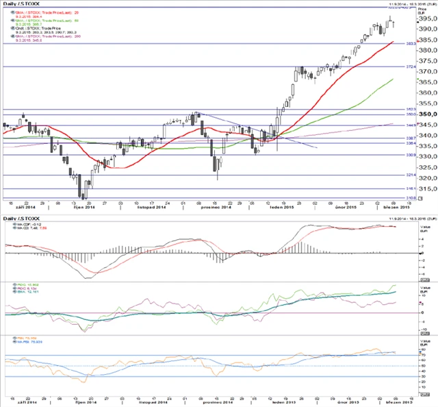 Technická analýza indexů S&P 500, DAX a Stoxx 600.