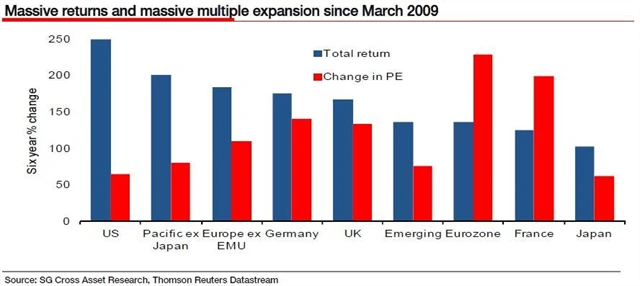 Navzdory mnohdy omílané vysoké valuaci vycházejí ze srovnání vítězně americké akcie, které nabídly největší zhodnocení, ale jejich P/E se zvýšilo jen zhruba o 65 % (v eurozóně poměr cen akcií a zisků stoupl o více než 200 %).