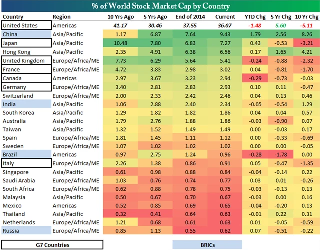 Tabulka ukazuje 25 největších akciových trhů světa seřazených podle tržní kapitalizace obchodovaných firem. Aktuální mírný pokles podílu USA lze vysvětlit mimo jiné silnou rally v Číně v posledních měsících. Podíl navzdory dobrému výkonu akcií v poslední době ztrácí Japonsko, které se ke svým rekordním úrovním ještě ani zdaleka neblíží.