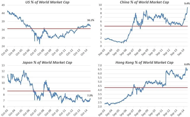 Amerika a ti ostatní, chtělo by se napsat. A asi ještě dlouho to bude pravda, ačkoli podíl trhů v USA na světové tržní kapitalizaci dlouhodobě spíše klesá. Skokanem poslední dekády je naopak Čína.