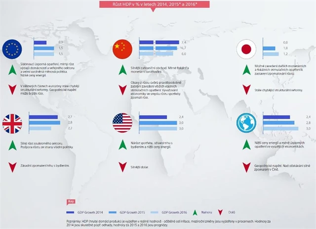 Růst: "Po zohlednění slabého prvního kvartálu snižujeme svůj výhled růstu světového HDP v letošním roce na 3,4 % z 3,5 %. Mělo by ale dojít k opětovnému zrychlení růstu ve 2Q2015, když odezní dočasná rizika v USA a v Japonsku a eurozóně začnou být v reálné ekonomice patrné dopady uvolněné měnové politiky a strukturálních reforem. Výhled pro rozvíjející se země je stále opatrný, řada těchto trhů je totiž stále ve fázi přechodu na nové a udržitelné růstové modely."