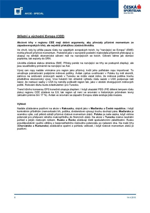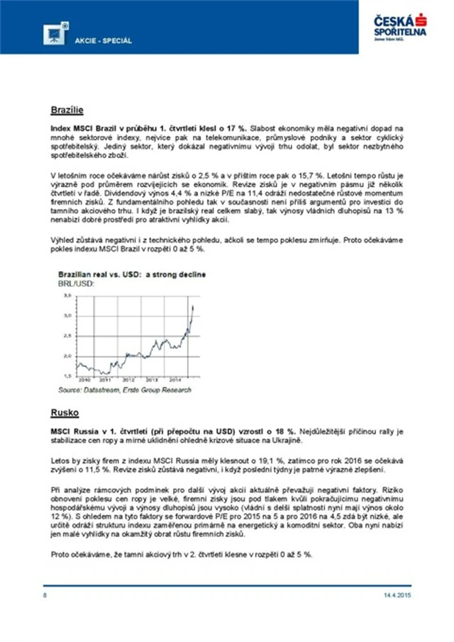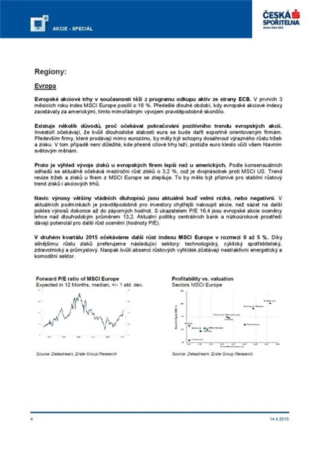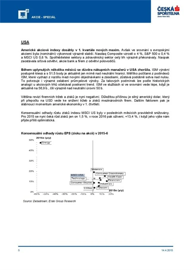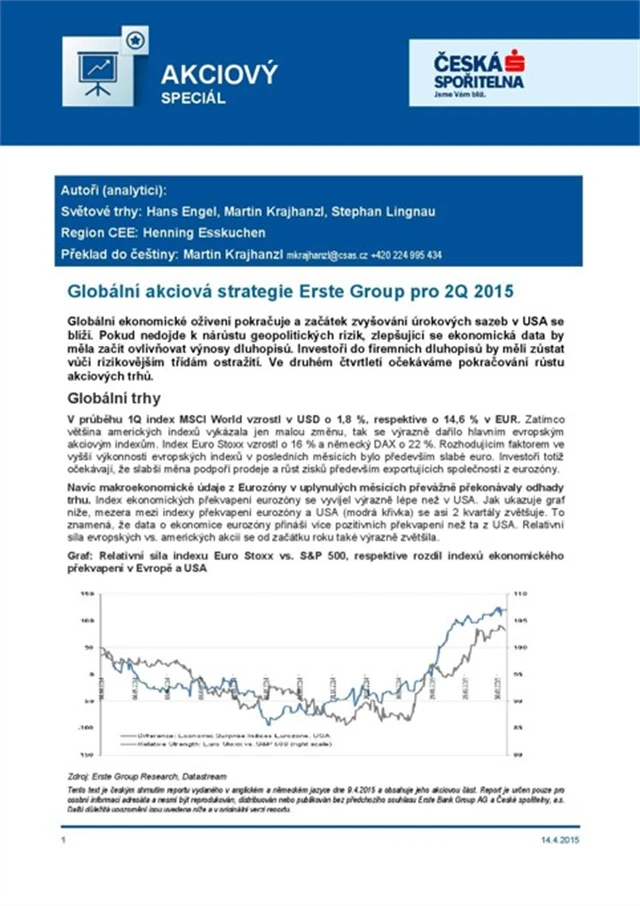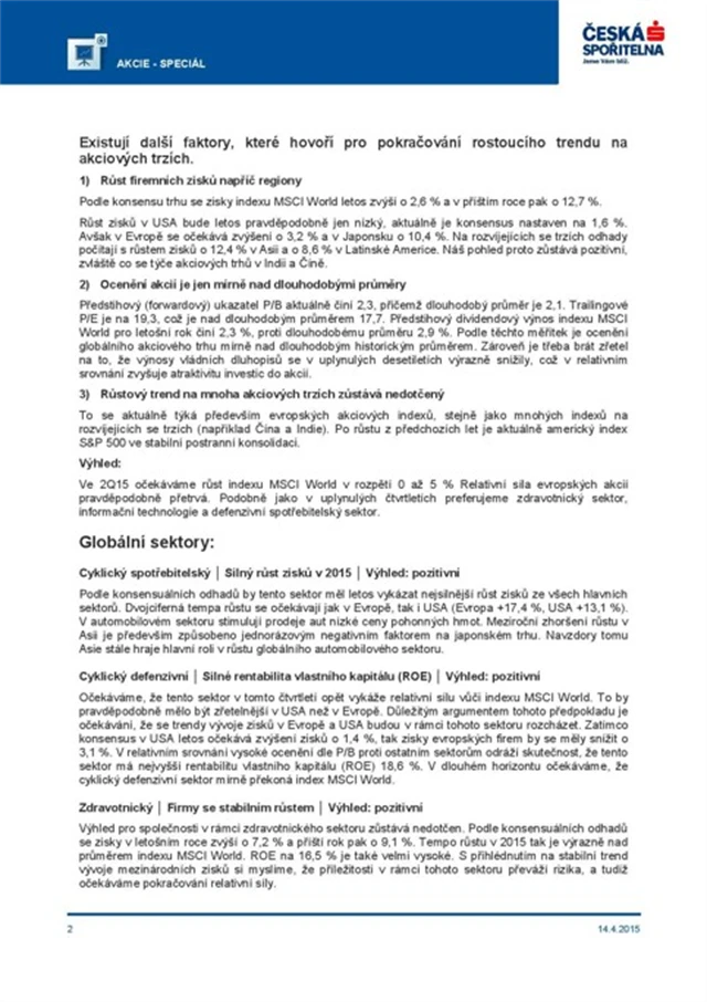 Ve 2Q2015 očekává Erste růst indexu MSCI World v rozpětí 0-5 %. Relativní síla evropských akcií pravděpodobně přetrvá. Podobně jako v uplynulých čtvrtletích preferuje Erste zdravotnický sektor, informační technologie a defenzivní spotřebitelský sektor.