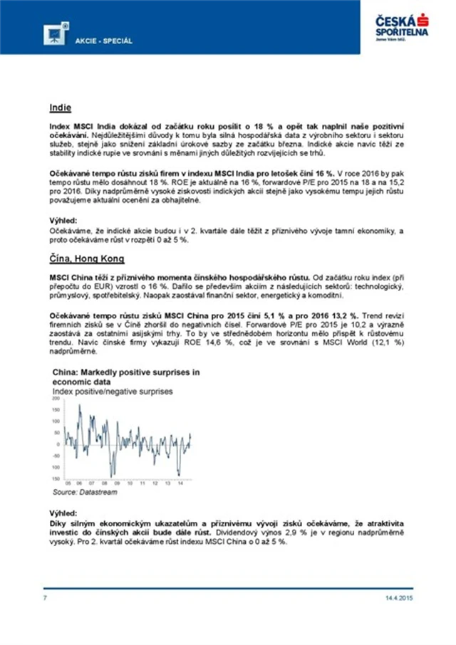 Podle konsenzu trhu se zisky firem z indexu MSCI World letos zvýší o 2,6 % a v příštím roce o 12,7 %. Růst zisků v USA bude letos pravděpodobně jen nízký, aktuálně je konsenzus na 1,6 %. V Evropě se ale očekává zvýšení o 3,2 % a v Japonsku o 10,4 %. Na rozvíjejících se trzích se počítá s růstem zisků o 12,4 % v Asii a o 8,6 % v Latinské Americe. Erste se tak akcie nadále líbí, obzvláště ty v Indii a Číně.