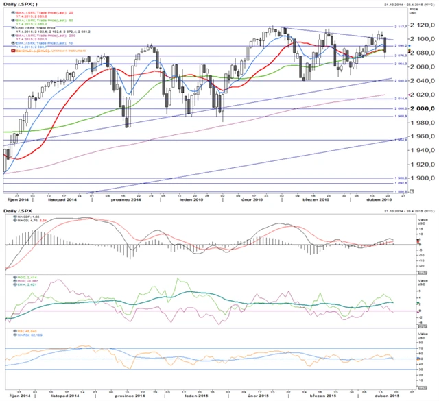 2 118 maximum, 2 084 20denní klouzavý průměr, 2 085 50denní klouzavý průměr, 2 020 200denní klouzavý průměr, 2 000 psychologická hranice.