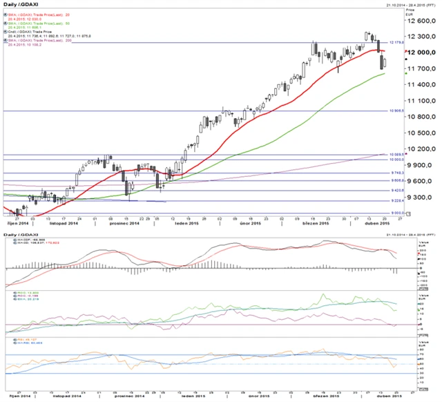 Index při vybírání zisků spadl až do pásma mezi 20- a 50denním klouzavým průměrem. MACD je jasně pod spouštěcí linií. ROC20 spadla k nule. RSI je v negativním pásmu pod hranicí 50 bodů.