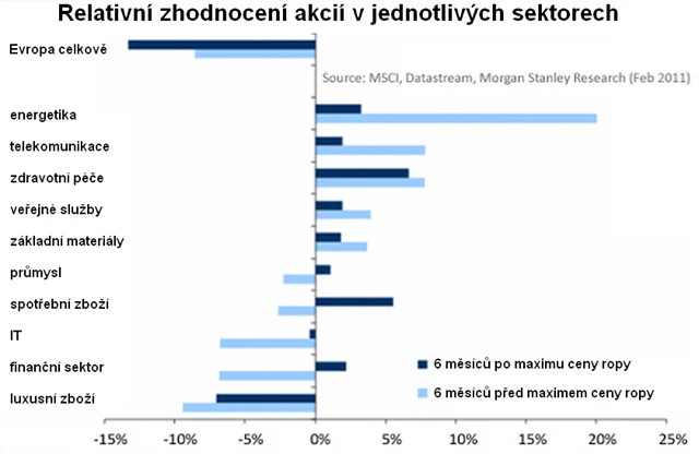 Analytici evropské Morgan Stanley dali dohromady zajímavý graf. Ukazuje, jak se dařilo jednotlivým sektorům v Evropě půl roku před a půl roku po dosažení maxima na cenách ropy. Situace ve Spojených státech nebude úplně stejná, ale jistě do velké míry podobná. Po dosažení vrcholu v ceně ropy se nejlépe dařilo sektorům zdravotní péče a zboží denní spotřeby, naopak nejhůře ze srovnání vycházejí akcie výrobců luxusního zboží (včetně aut) a sektoru IT.