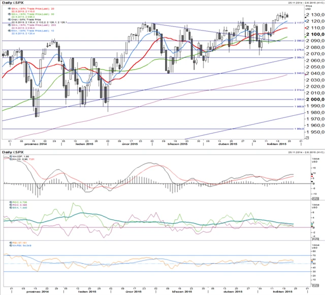 2 131 maximum, 2 110 20denní klouzavý průměr, 2 100 klesající trendová linie, 2 095 50denní klouzavý průměr, 2 038 200denní klouzavý průměr.