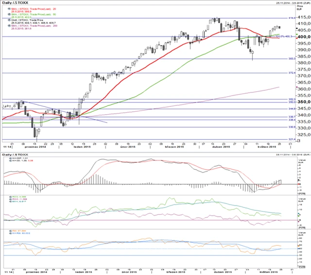 Technické indikátory se zlepšily spolu s překonáním klouzavých průměrů. V následujících dnech očekáváme obchodování kolem současných úrovní, je ale možné i testování lokálního maxima na 414 bodech.