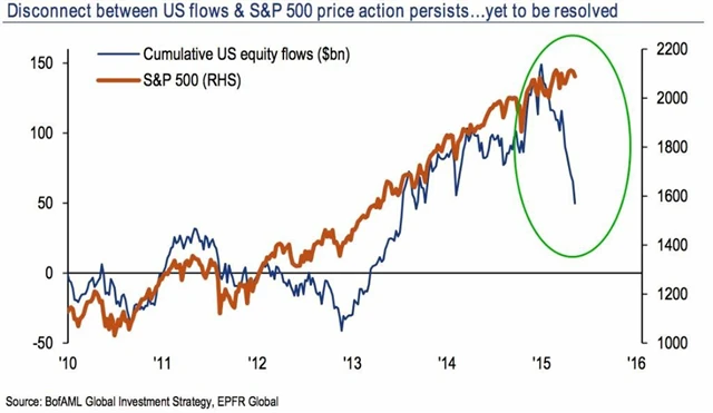 Poněkud neintuitivnímu grafu jsme se věnovali již dříve. "Robustní výkonnost indexu ale mohou udržovat nákupy suverénních fondů, penzijních fondů a centrálních bank, tedy investorů, jejichž obchody nejsou ve statistice pohybu peněz v akciových fondech zahrnuty. Přetrvávající nízké očekávané zisky z investování do dluhopisů zůstávají motorem dlouhodobé rotace do akcií," píše Michael Hartnett z Bank of America Merrill Lynch.