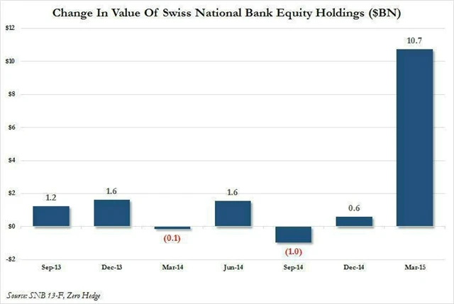 Ne všichni však mají z budoucnosti strach. Květnová zpráva švýcarské centrální banky (SNB) ukazuje, že zatímco američtí investoři se z akciového trhu stahují, SNB na něm naopak ve velkém nakupuje. Od třetího čtvrtletí 2013 se akciové portfolio švýcarské centrální banky v každém kvartálu zvětšilo maximálně o 1,6 miliardy USD, v letošním prvním čtvrtletí ale banka nakoupila akcie za téměř 11 miliard dolarů.