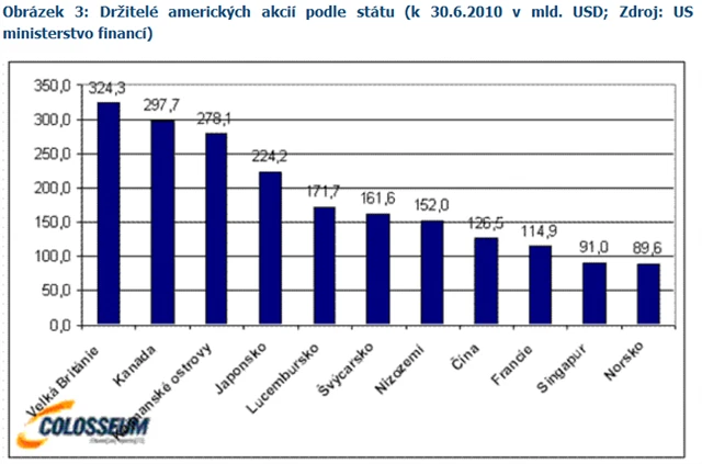 Poslední graf zachycuje americké akcie držené zahraničními subjekty. První místo obsadila Velká Británie (324 mld. USD), druhé Kanada (297 mld.), třetí Kajmanské ostrovy (278 mld.) a čtvrté se umístilo Japonsko (224 mld.). Opět je zde však nutné zopakovat upozornění z konce předchozího odstavce.