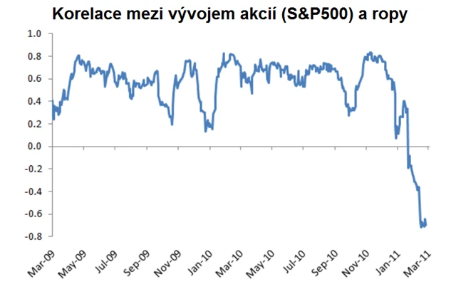 Od začátku býčího trhu v březnu 2009 měly akcie a ropa velmi úzký vztah (silnou korelaci). Většinu času se nahoru posunovaly akcie ruku v ruce s ropou. V posledním měsíci se však cesty akcií a ropy výrazně rozešly a měsíční korelace je na úrovni -0,7. Jinými slovy - čím je korelace "zápornější", tím se směry vývoje těchto dvou investičních nástrojů více rozcházejí.